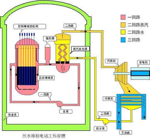 一回路: 反應堆堆芯因核燃料裂變產生巨大的熱能,主泵將一回路的水泵入堆芯吸收熱量后變成高溫高壓水,流經蒸汽發生器的倒U型管,將熱量傳遞給管外的二回路水。